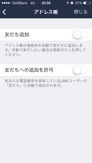「アドレス帳」画面にて、 友だち追加 オフ 友だちへの追加の許可 オフ