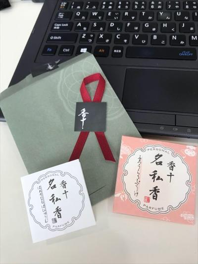 色々な会議やセミナーなどでご一緒している㈱morichの森本社長より、 「名私香」というパーソナルパフュームのプレゼントを頂きました。 そういえば、以前お名刺交換させて頂いた時に、ほんのり香りがしていたのは、 こんな素敵な心遣いだったんだ!と気づいて、思わず笑顔になりました。