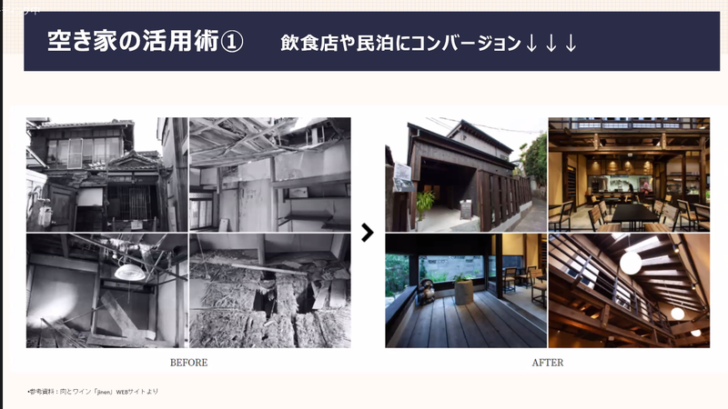 たとえば、上のように飲食店や民泊として、という活用方法や、ときに、建物ではない活用方法も、という内容から、いかに柔軟な発想が大切か、ということも学びました。