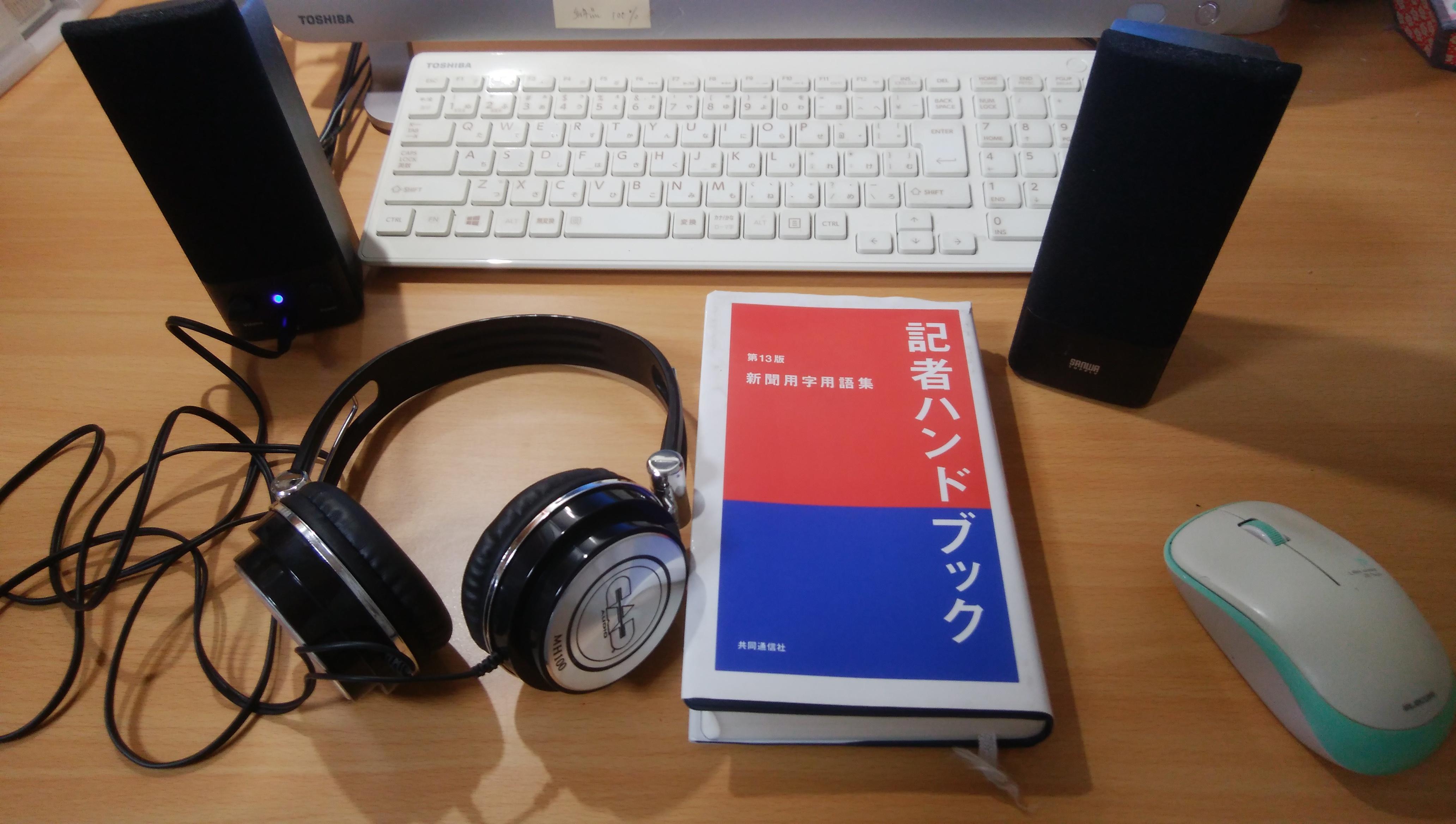 合わせて、音声の聞きやすさのためにヘッドフォンとスピーカーがあるとよいでしょう。パソコン本体からの音声よりスピーカーを通したほうが聞きやすいと思います。
