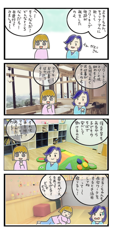 まるこちゃん、今日はキャリア・マムに新しくできたコワーキング施設を見学ですよ。