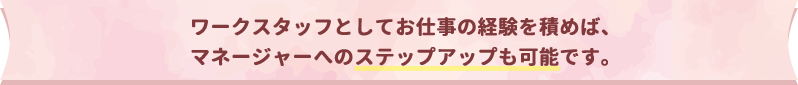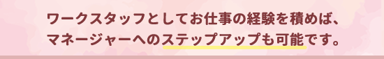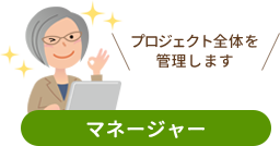 お仕事ごとにワークスタッフ、グループリーダー、マネージャーがひとつのプロジェクトチームをつくって業務にあたります。ワークスタッフとしての経験を積むと、研修を経て、ワークスタッフを取りまとめるグループリーダーや、プロジェクト全体を管理するマネージャーへとステップアップすることができます。