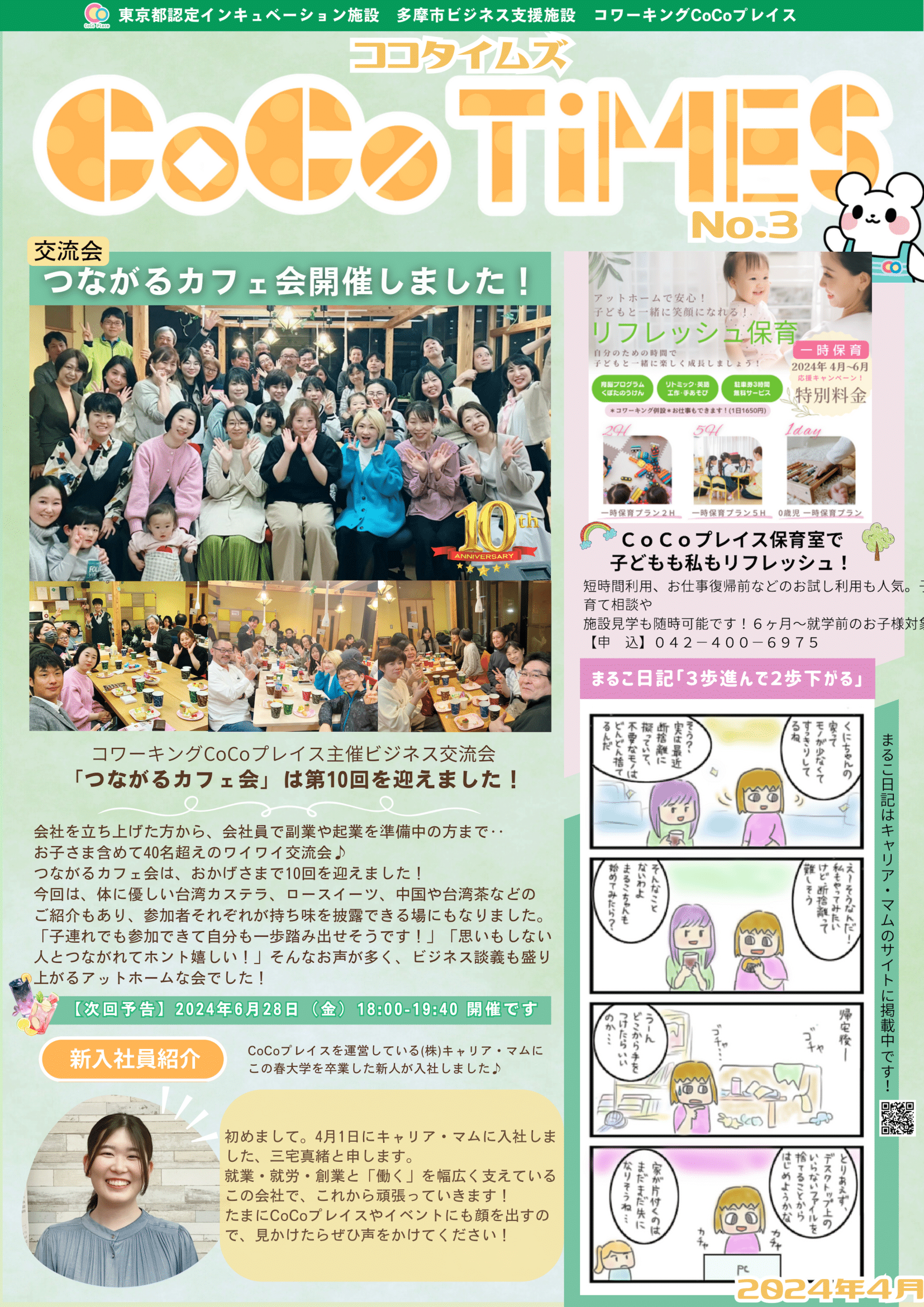 CoCoプレイスの情報をぎゅっとまとめたCoCoTIMES、 第3号では、キャリア・マム新入社員のまおちゃんが登場しますよ! 受付にて配布中ですので、ぜひ手に取ってご覧ください♪
