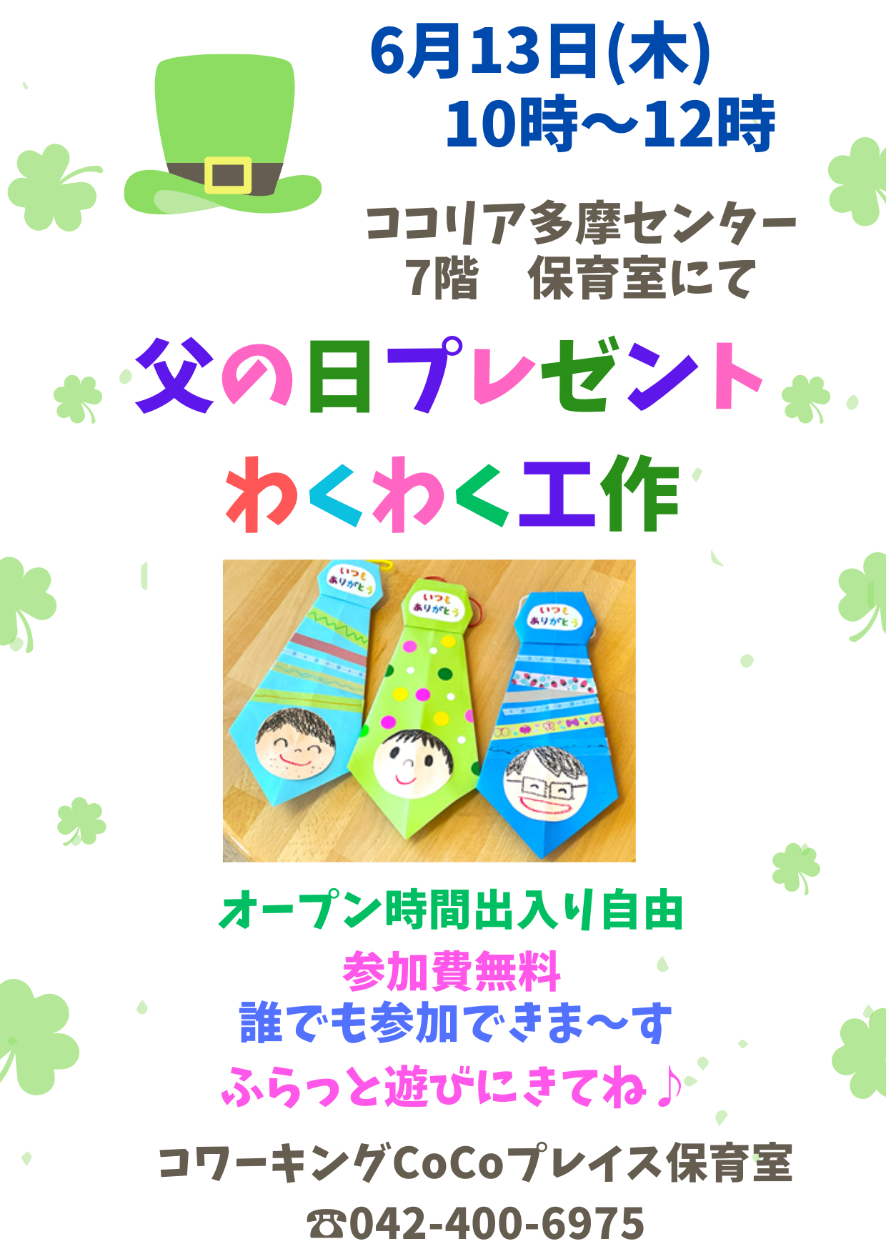 6月16日(日)は父の日♪ CoCoプレイス保育室では、6月13日(木)に 未就学児&保護者の方を対象としたわくわく工作を開催します!