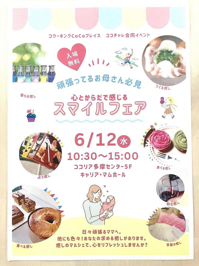 CoCoプレイス起業塾「ココチャレ」1期~6期のメンバーが 合同イベントを開催します! 1日過ごせる楽しいイベントです。 香り、カード、占い、スイーツ、ワインなど10のお店が出店! 癒しのマルシェにぜひお越しください♪