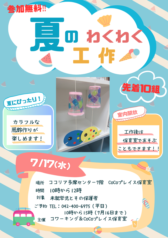 CoCoプレイス保育室イベント☆ 夏にぴったりな、カラフル風鈴づくりをします! 工作後は保育室で遊ぶこともできます♪