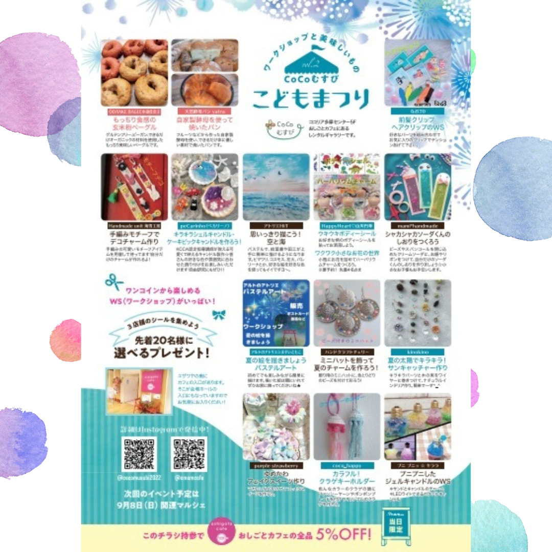 ・ワンコインから楽しめるワークショップがいっぱい♪ ・夏気分を盛り上げる手作り雑貨・アクセサリー販売 ・美味しいベーグル・パンの販売♪
