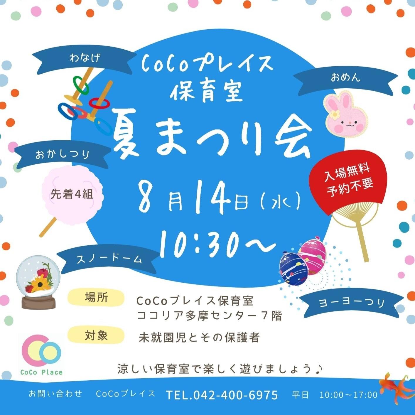 【日 時】8月14日(水)10時30分~ 【会 場】CoCoプレイス保育室 【参加費】無料 【申 込】予約不要、直接保育室にお越しください♪