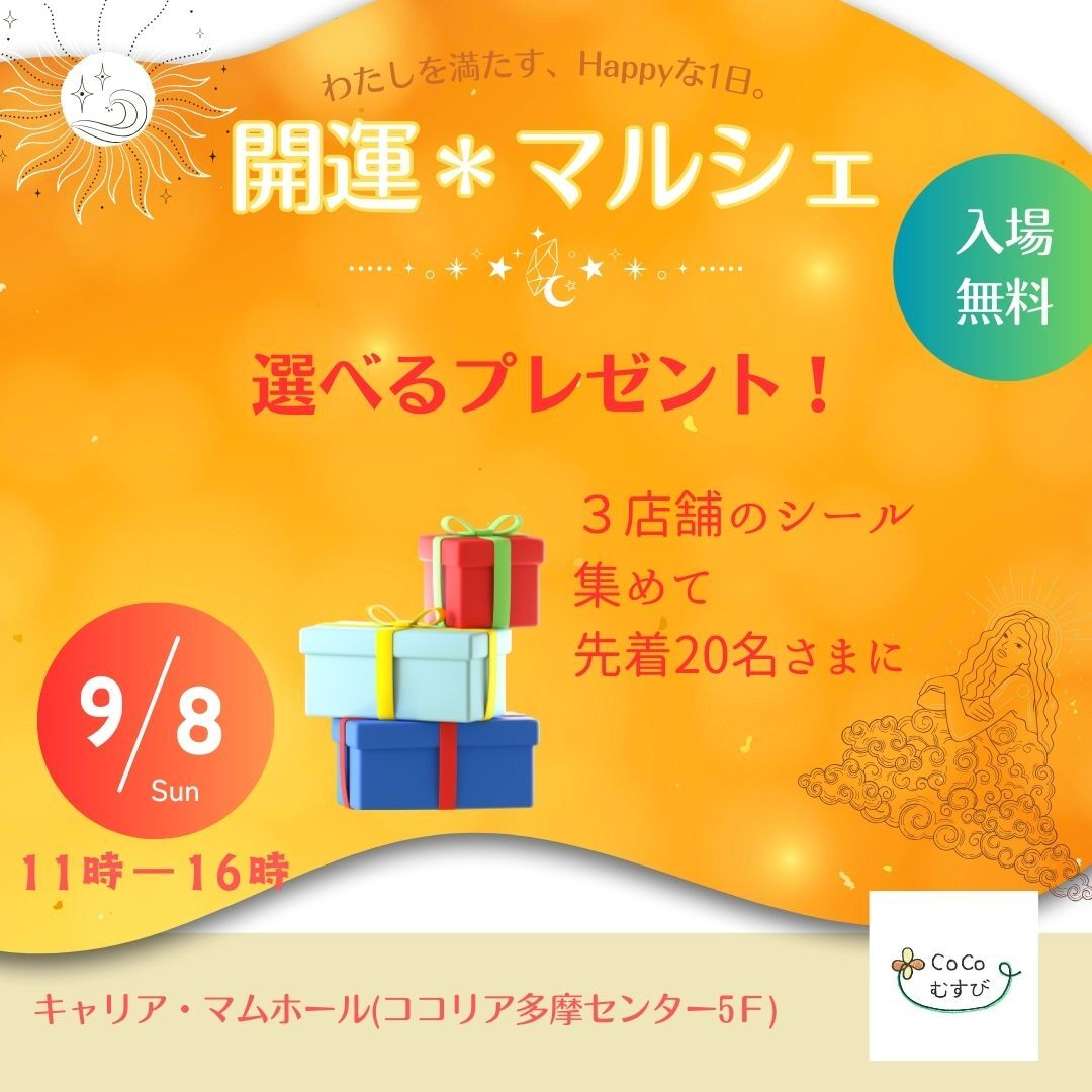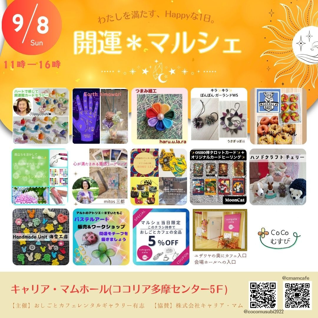 【日 時】9月8日(日)11〜16時 【会 場】キャリア・マムホール(ココリア多摩センター5階) 【内 容】カード、カラー、手相、開運モチーフ、 玄米ベーグル、手作り小物販売など 【入場料】入場無料・ブースは有料(金額は出店者にご確認ください)