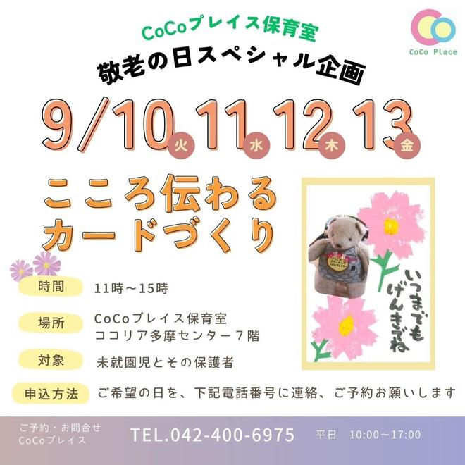 【日 時】9月10日(火)・11日(水)・12日(木)・13日(金) 11時~15時 【会 場】CoCoプレイス保育室 【参加費】無料 【申 込】ご希望の日をお電話でご連絡ください。 042-400-6975(CoCoプレイス受付)