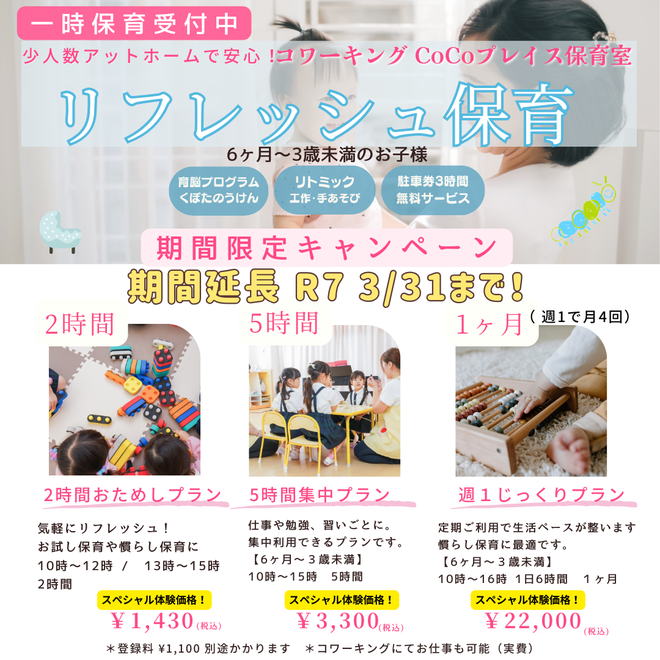 お問い合わせ・ご予約は、CoCoプレイス保育室まで