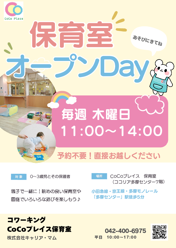 【お問合せ】042-400-6975(平日10:00~17:00) CoCoプレイス保育室まで