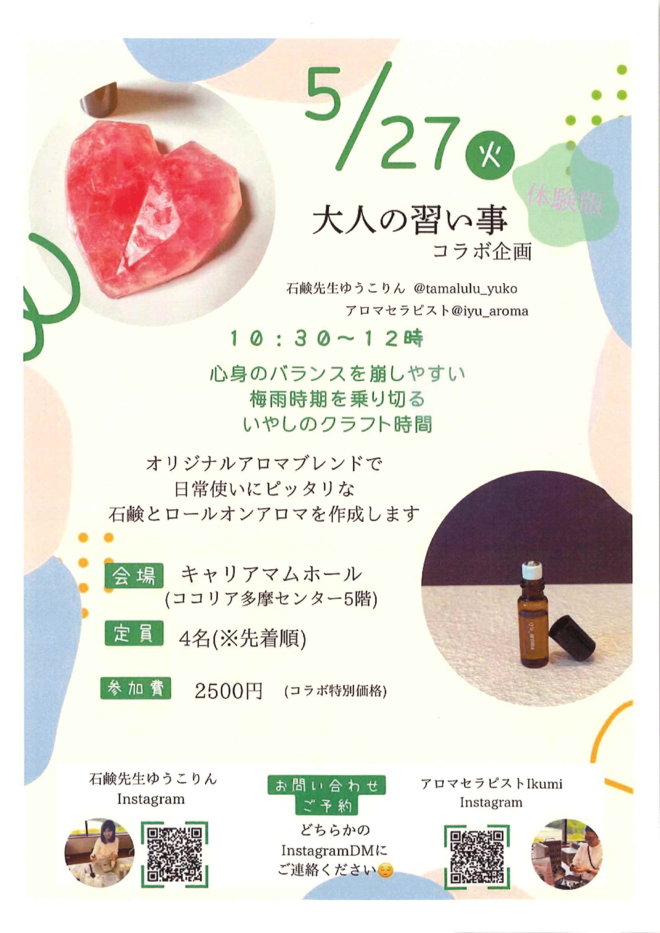 オリジナルアロマブレンドで、日常づかいにぴったりな石けんとロールオンアロマを作ります♪