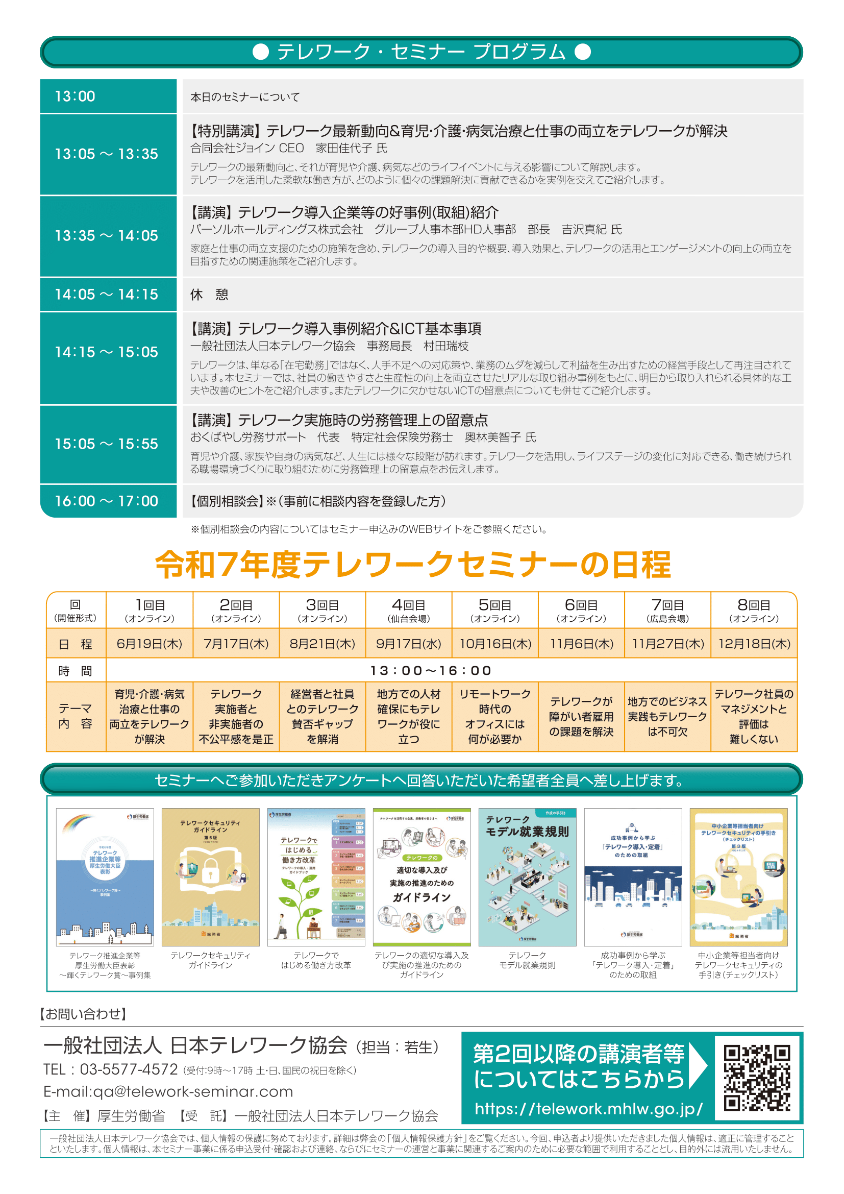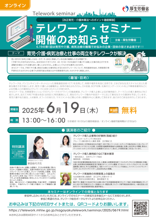 【申込・お問合せ】https://telework.mhlw.go.jp/kagayakutelework/seminar/2025/0619.html