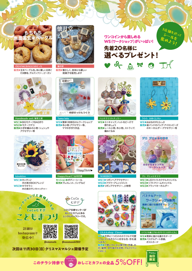 【日 時】8月7日(木)11:00~16:00 【会 場】キャリア・マムホール 【内 容】ボディシール、リボンアクセサリーWS、キャンドルWS、 編み物WS、パステルアートWS、クレヨンWS、木の実のアレンジWS アクセサリー、天然石、玄米ベーグル、焼き菓子 など 【入場料】無料