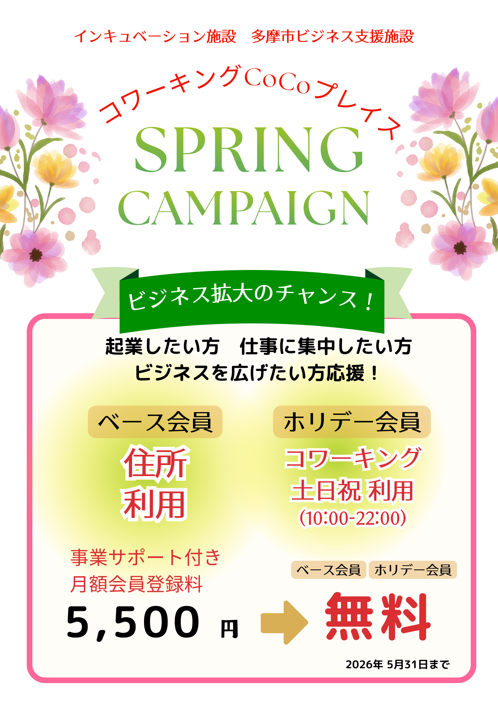 CoCoプレイスでは、ただいまスプリングキャンペーンを実施中! ベース会員・ホリデー会員の登録料が無料になります!