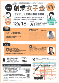 子育て中や介護中でも、無理なく自分にあった創業を学ぶ、女性向け創業セミナーです。 かなえ社長が登壇します!実際に起業している先輩のお話も聞けて起業に一歩近づけるセミナーです♪