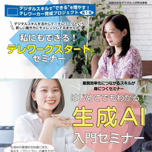 | 【開催日】 | テレワークスタートセミナー:2025年9月5日(金) 生成AI入門セミナー:2025年9月12日(金) |