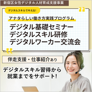 | 【会 場】 | オンデマンド キャリアデザインセミナー:四谷保健センター ※申込受付終了 キャリアスタートコース:IT技術者:新宿区立産業会館 ※申込受付終了 Webマーケター:四谷地域センター ※申込受付終了 Webライター:四谷保健センター ※申込受付終了 |