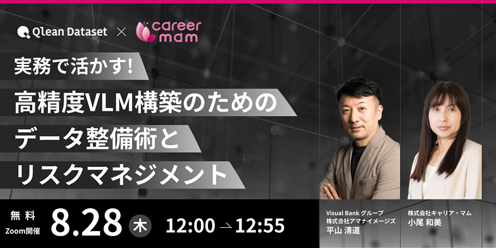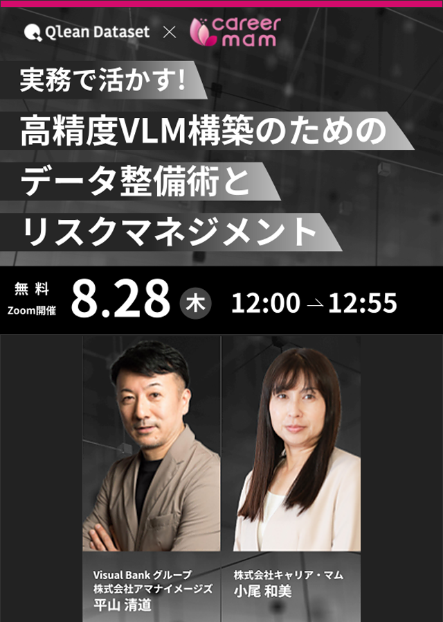 また、著作権やプライバシー、情報出典に関わるリスクとその回避策についても取り上げ、商用利用における安心・安全なデータ作成のあり方を学べる内容です。VLM開発に携わる方はもちろん、データ整備の課題を抱える方にとって必見のセミナーです。
