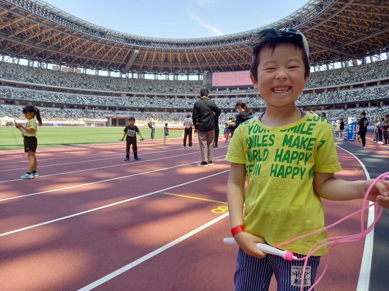 東京オリンピックでテレビ越しに見ていた新国立競技場に立つことができ、息子も大喜びでした。特に、なわとびの7重跳び世界記録保持者もりぞーさんのパフォーマンスがすごかったです。イベント帰宅時から、息子は「なわとびやる!なわとびやる!」と言って、家の中でもジャンプしています。すてきな機会をいただいた、瞬足に感謝です!(Wさん)