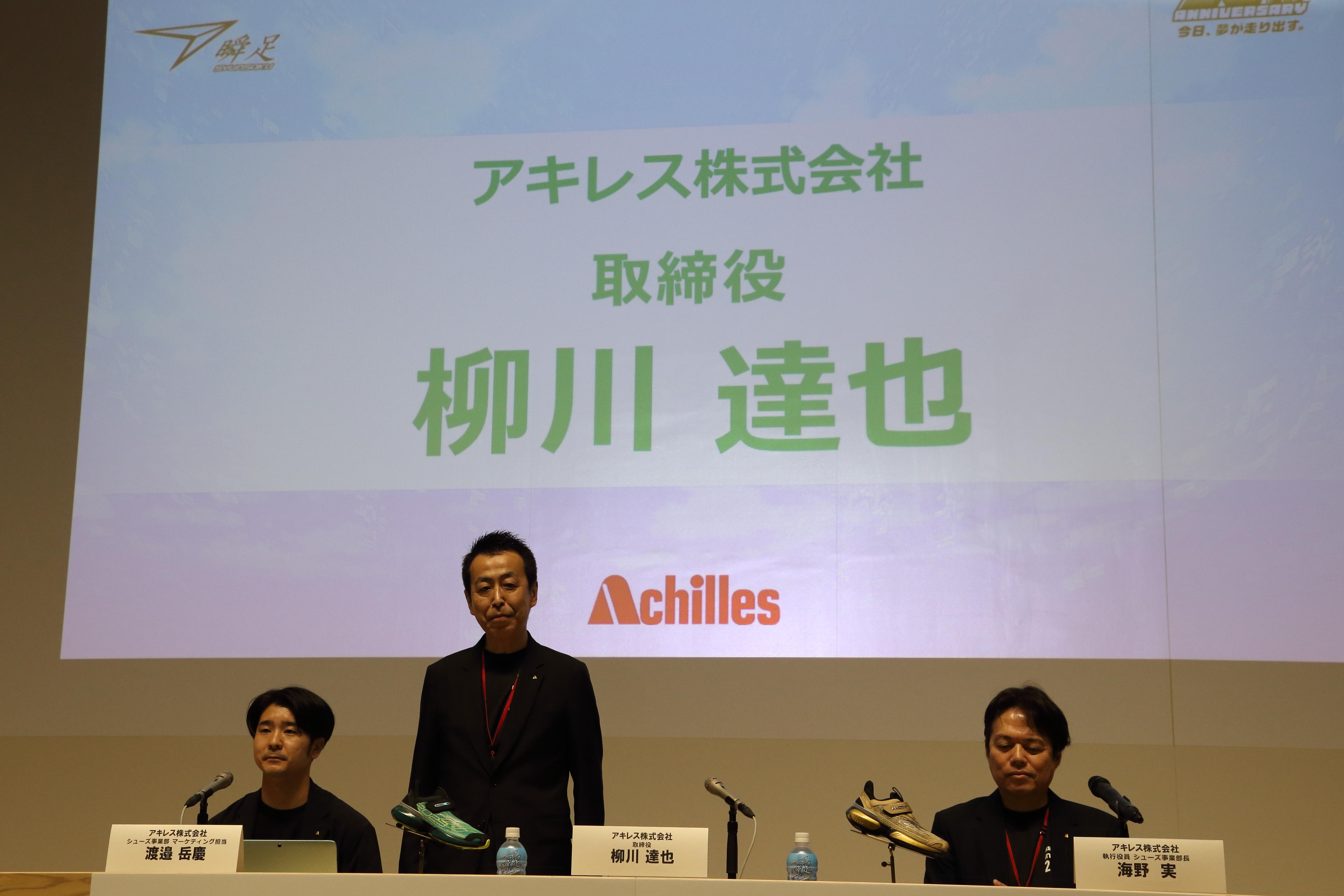 記者発表会は、柳川取締役からの「瞬足は2003年5月、トラックの左まわりで転倒することも多かった子どもたちを『力いっぱい走らせてあげたい』という思いから誕生しました」というお言葉からスタート。