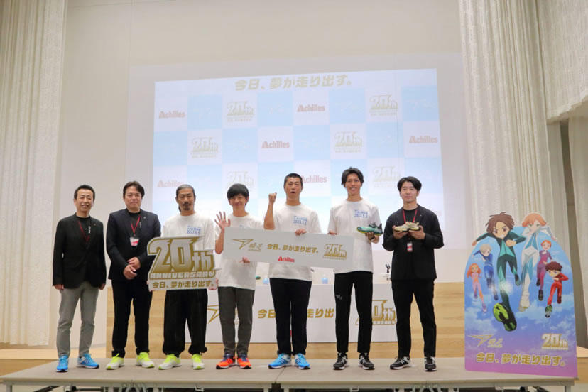 瞬足 JJ-055を手に。記者発表会では、走り高跳び佐藤凌選手と人気お笑いトリオパンサーさんのトークセッションも