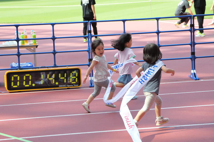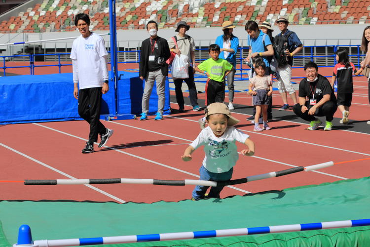 フィールドでは、トラックを初めて走るお子さんから小学生までが参加できるかけっこを実施。順天堂大学陸上部のお兄さん、お姉さんが、走りたいちびっこのための準備を丁寧に行っていました。ランニング・ドリルの要素を取り入れた準備運動ひとつとっても、なかなか経験できるものではありません。