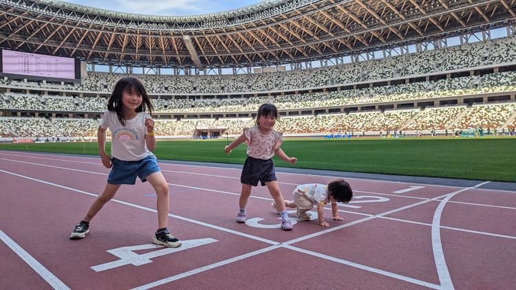 親子ともはじめて国立競技場内に入り、その広さと設備に驚きました!テレビで見ていた陸上選手はこんなにも広いところを走っていたんだ!と子どもたちもアスリートのすごさを体感したようです。