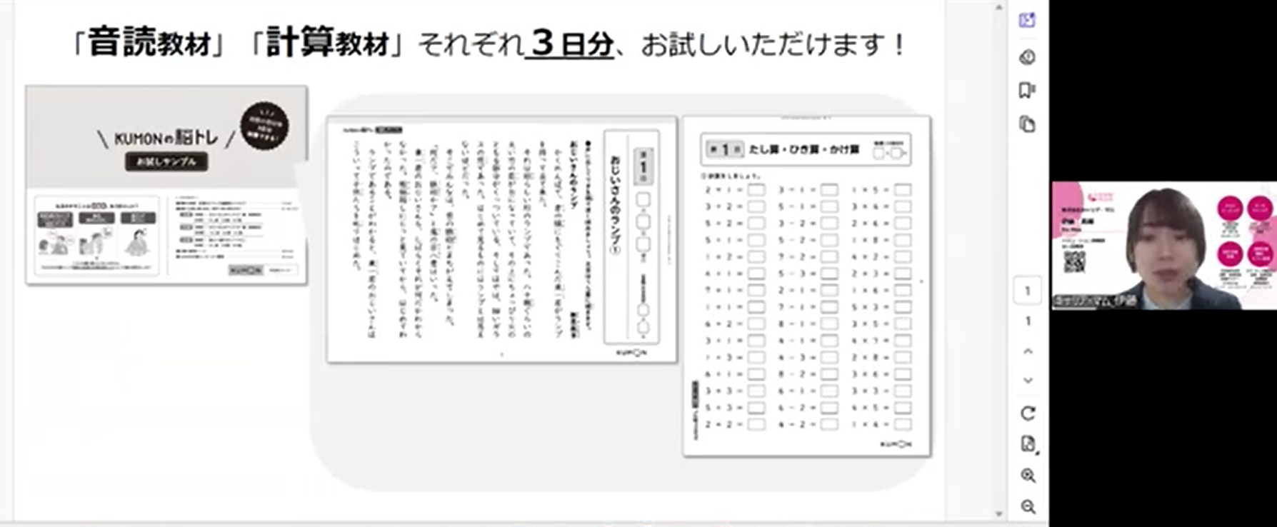 今回ご参加いただいた方に3日分の教材体験ができる「KUMONの脳トレ お試しサンプル」のご案内と、その後の1カ月のモニター説明がありました。