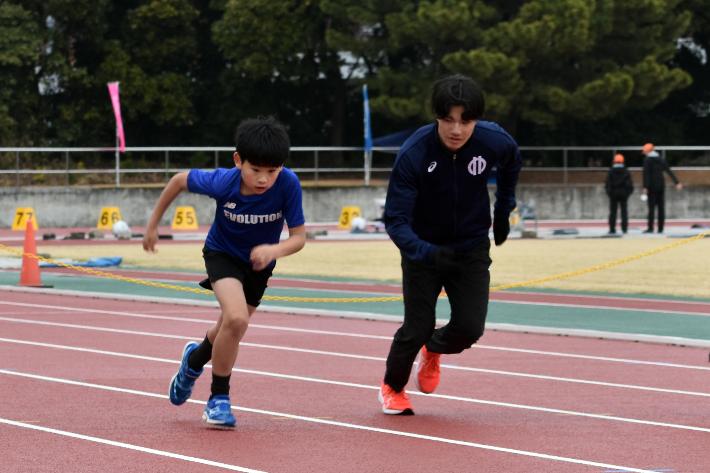指導にあたったのは、順天堂大学の柳谷登志雄教授をはじめ、陸上部員や現役選手たちです。無駄のない動きと鍛え抜かれた体幹が伝わる美しいフォームは、見ているだけでも学びになるほどでした。その姿に刺激を受けた子どもたちは、姿勢や足の動きを意識しながら、夢中で体を動かします。