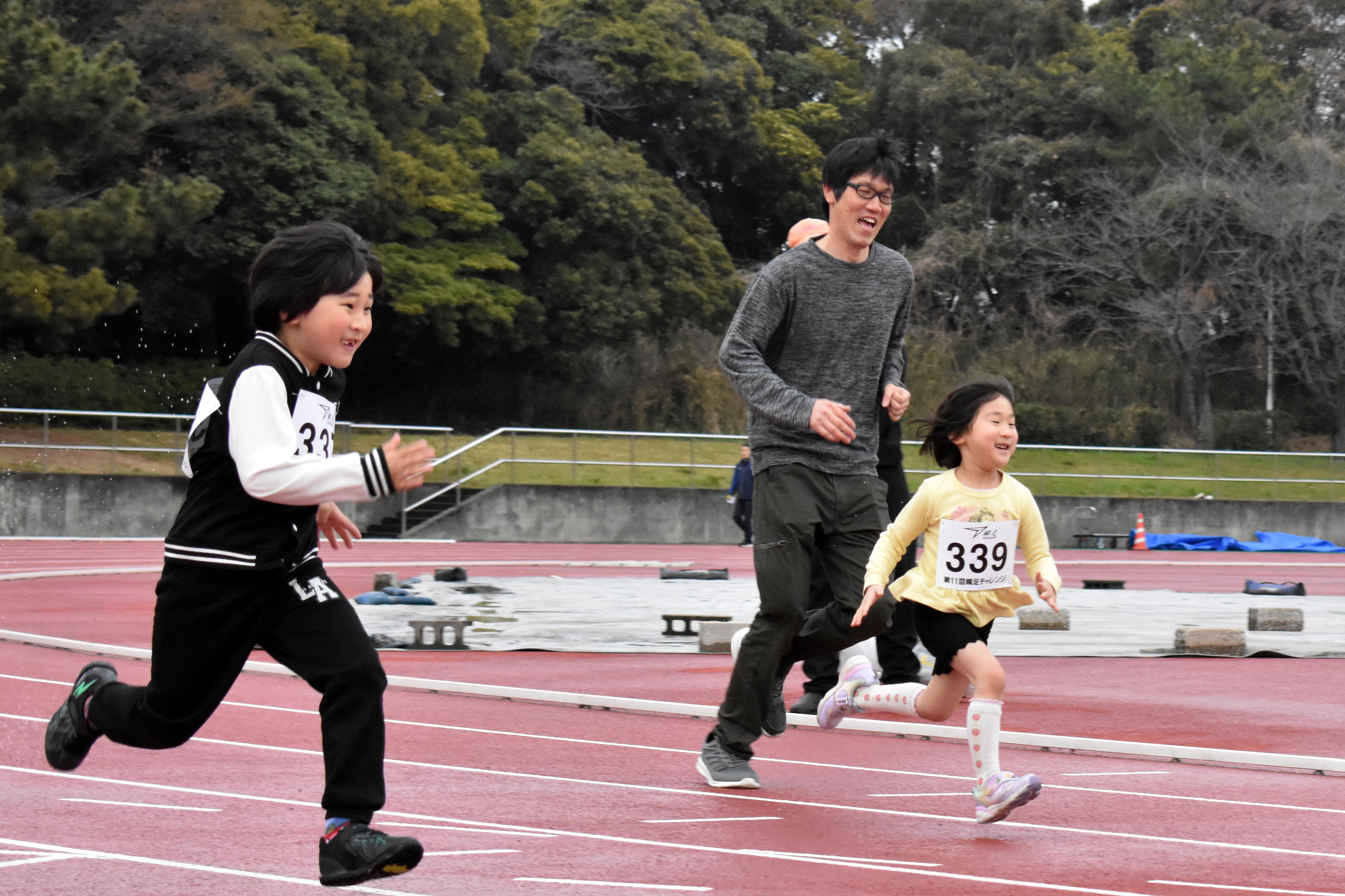 すべての競技が終わった後に行われたのは、未就学児が参加する「ミニミニ走(32m32cm)」です。親子2人1組での参加が基本ですが、「好きに走っていいよ。1人で走れる子は、1人でもいいよ」との声かけに応えて、1人で挑戦する子の姿もありました。