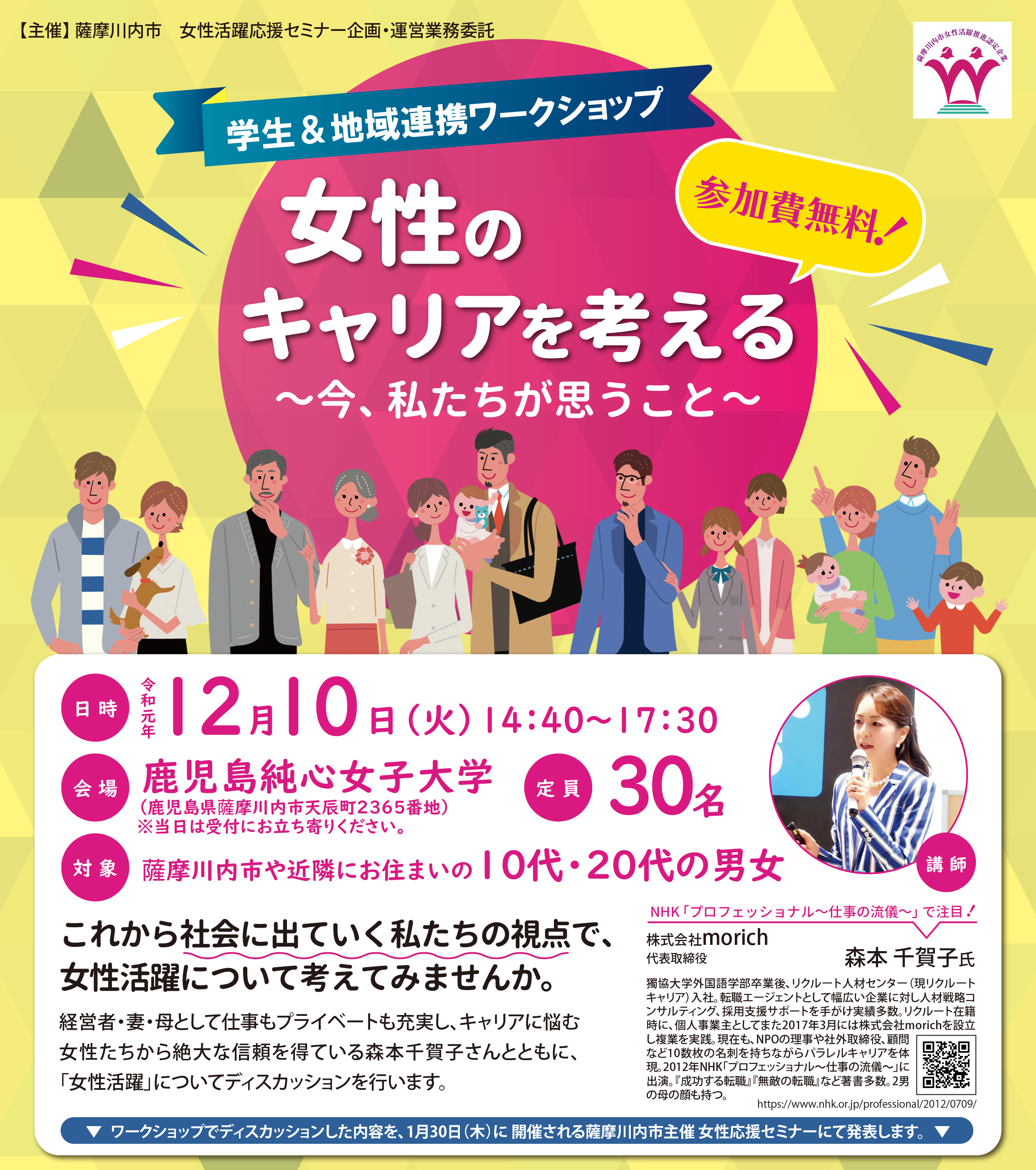 ※ワークショップでディスカッションした内容を、令和2年1月30日(木)に開催される薩摩川内市主催 女性応援セミナーにて発表します。