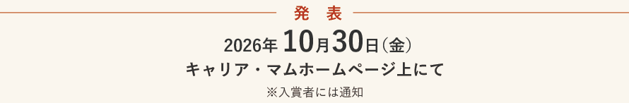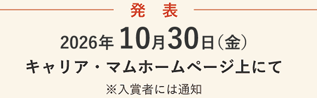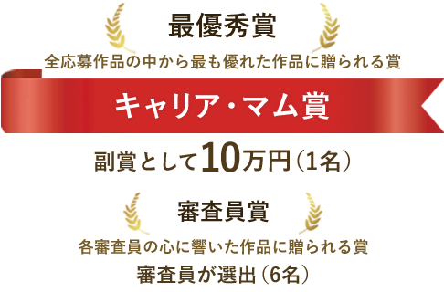 | 賞および特典 | ・<最優秀賞>キャリア・マム賞(1名) 10万円全応募作品の中から最も優れた作品に贈られる賞・審査員賞(6名) 各審査員が選出各審査員の心に響いた作品に贈られる賞 |