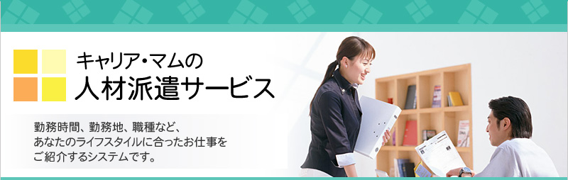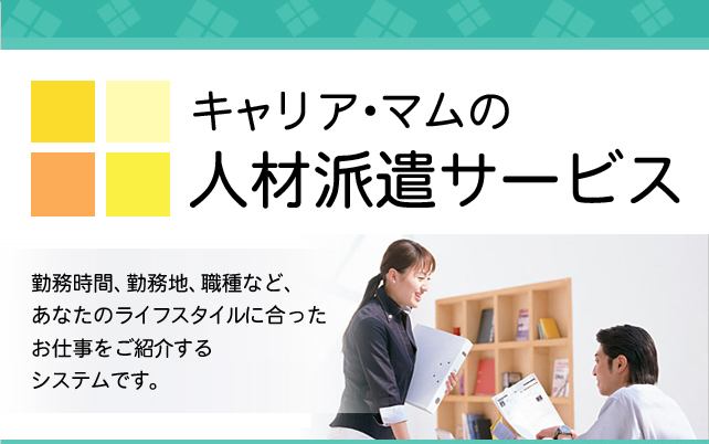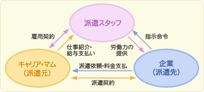 人材派遣は、正社員・アルバイト・パート・契約社員としてではなく、「労働者派遣法」という法律に基づき、 キャリア・マムがお仕事をして下さるみなさんとの雇用契約を結び、派遣先企業の指示の下でお仕事をしていただく働き方です。