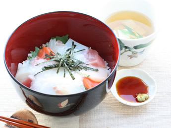 - 3. 2を器に盛り、刺し身と大葉をのせ、長いもをすりおろしたものをかける。
