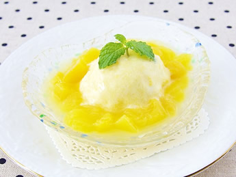 - 1. マンゴーの缶詰(果肉:150g)・・・一口サイズに切ってボウルでヨーグルトと混ぜ合わせて6等分にし、バットに入れて冷凍庫で4時間ほど凍らせて、シャーベットを作る。