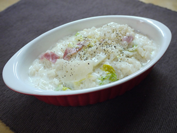 - 1. 鍋に牛乳とコンソメ、白菜、ベーコン、かぶを入れ、弱めの中火で加熱し、野菜がしんなりするまで沸騰してから3分ほど煮る。