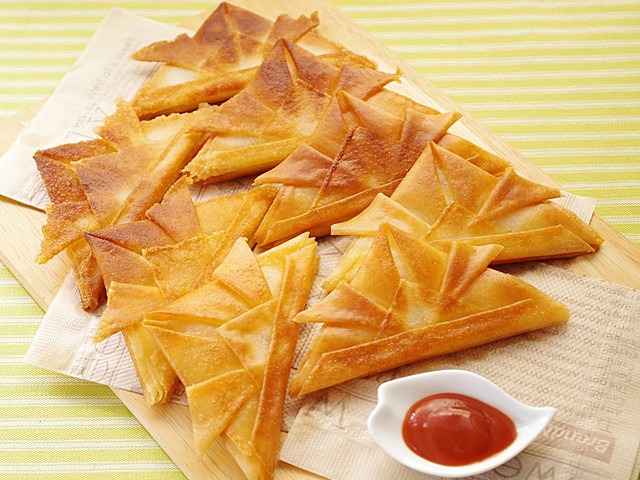 - 春巻きの皮...三角形に折ってはみでた部分を切り落とし、逆三角形の向きに置く。