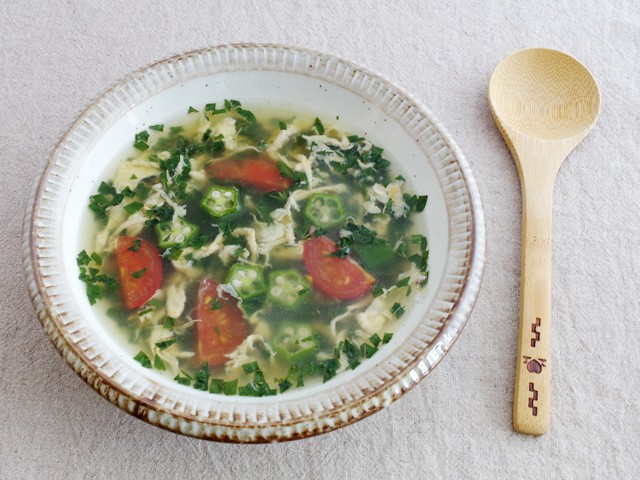 - 1.鍋に水を入れて強火で煮立たせた、チキンブイヨンとモロヘイヤ、オクラを入れて中火で5分ほど煮る。