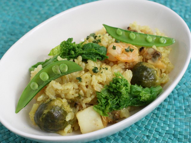 - 1.フライパンにオリーブオイルを熱して玉ねぎとシーフードを炒め、米とカレー粉、塩(小さじ1/3)、コショウを加えて混ぜながら炒める。