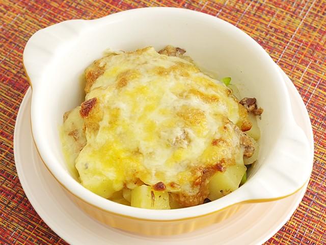 - 2.グラタン皿に1を均等に入れて下準備したソースを全体にかけ、ピザ用チーズをのせる。