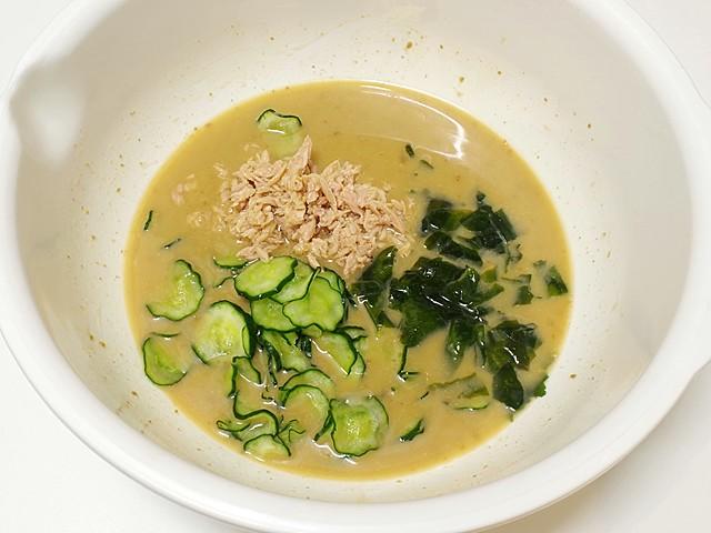 - キュウリ...小口切りにして塩を振って軽くもみ、5分ほど置いて手で水気をしぼる。