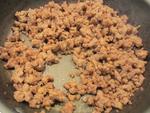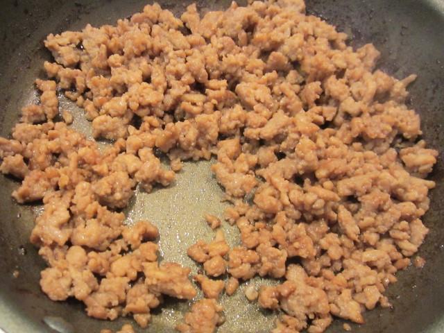 フライパンにしょうゆとみりんを入れ、鶏ひき肉を加えて中火で加熱し、攪拌しながら汁気がなくなるまで煮詰めて火を通す。