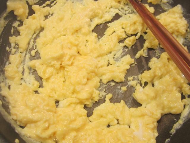 フライパンにサラダ油を熱し、卵を溶いて塩を加えた卵液を流し入れ、かき混ぜながら火を通す。カップにご飯を詰めて1と重ならないようにのせる。