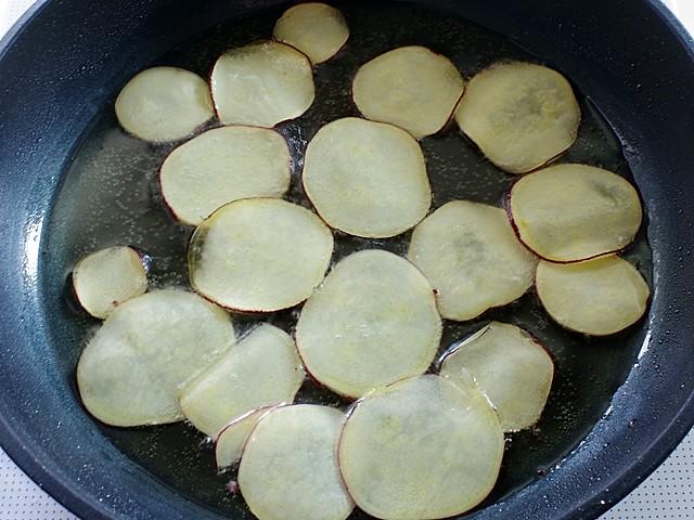 - さつまいも...しっかり洗って皮付きのままスライサーで薄くスライスし、5分ほど水に浸して水切りをする。