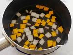 - かぼちゃ...皮をむいて種とワタを取り除き、縦8㎜×横8㎜×厚み3㎜ほどに切る。