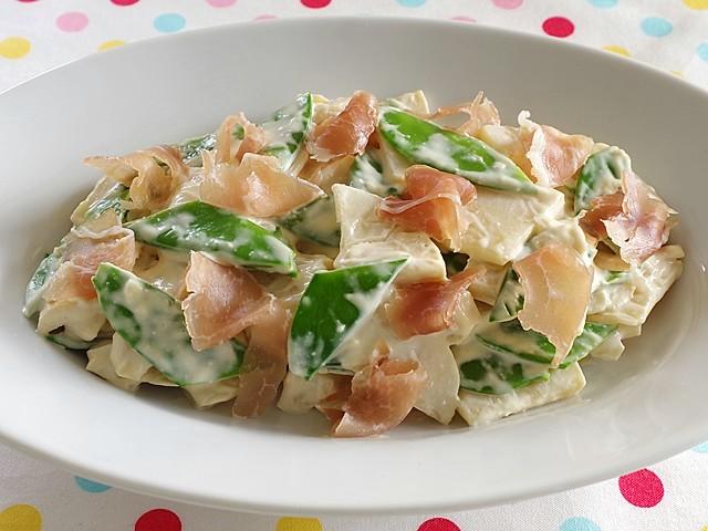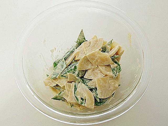 - さやえんどう...ヘタと筋を取り除いて水にくぐらせ、耐熱皿に置いてラップをかけ、電子レンジ(600W)で約1分加熱する。斜めに2等分に切る。