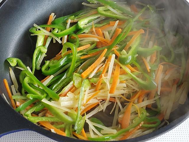 - ピーマン...ヘタとワタを取り除いて縦長に細切りにする。