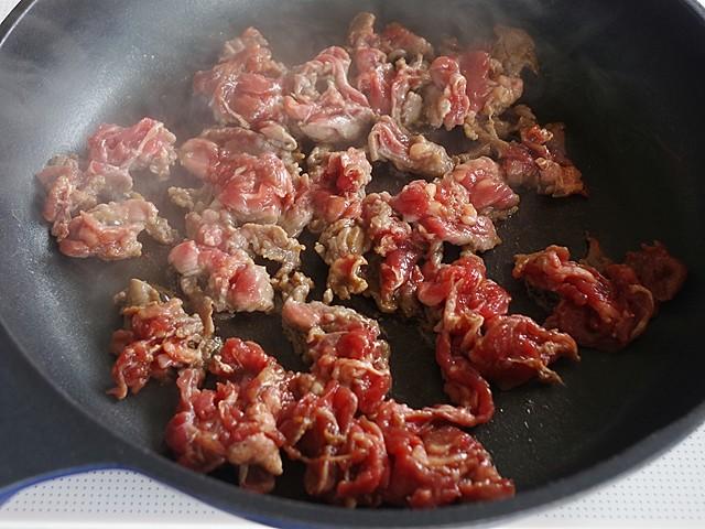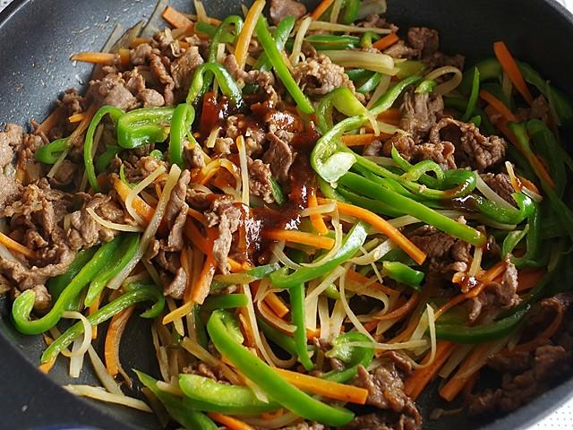 - 牛肉...ポリ袋に入れ、塩コショウを振って焼き肉のタレ(大さじ2)を入れもんで5分ほど置く。